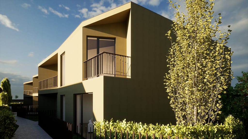 Este conjunto habitacional em banda foi concebido com especial atenção à orientação solar, à integração do elemento verde e à sua articulação com a envolvente construída. O volume contínuo integra quatro moradias independentes, distribuídas por cave, rés-do-chão e primeiro andar.