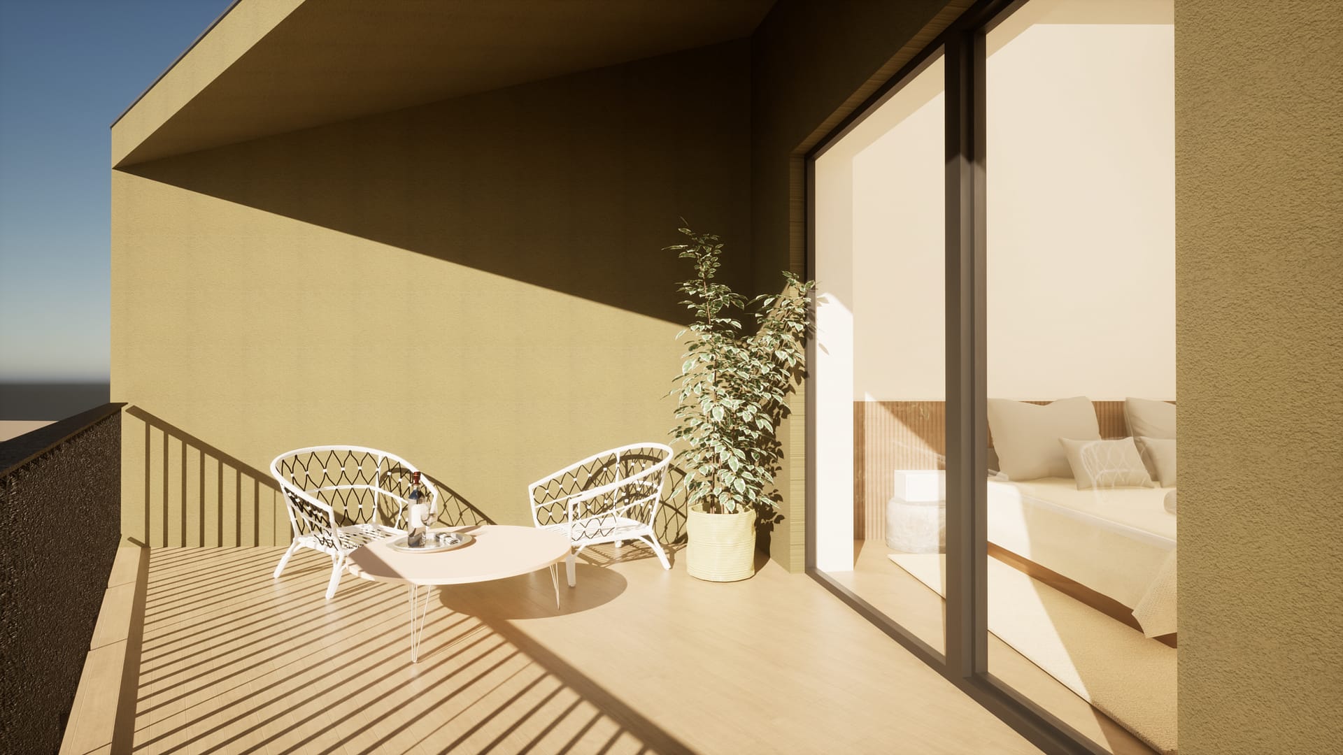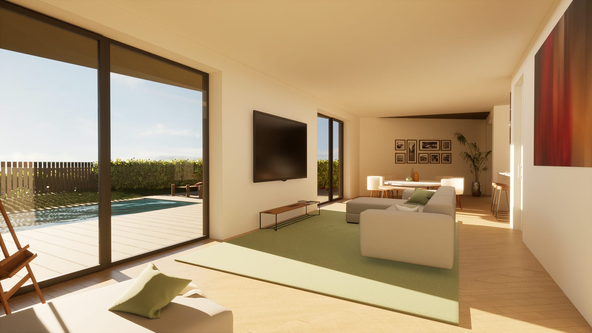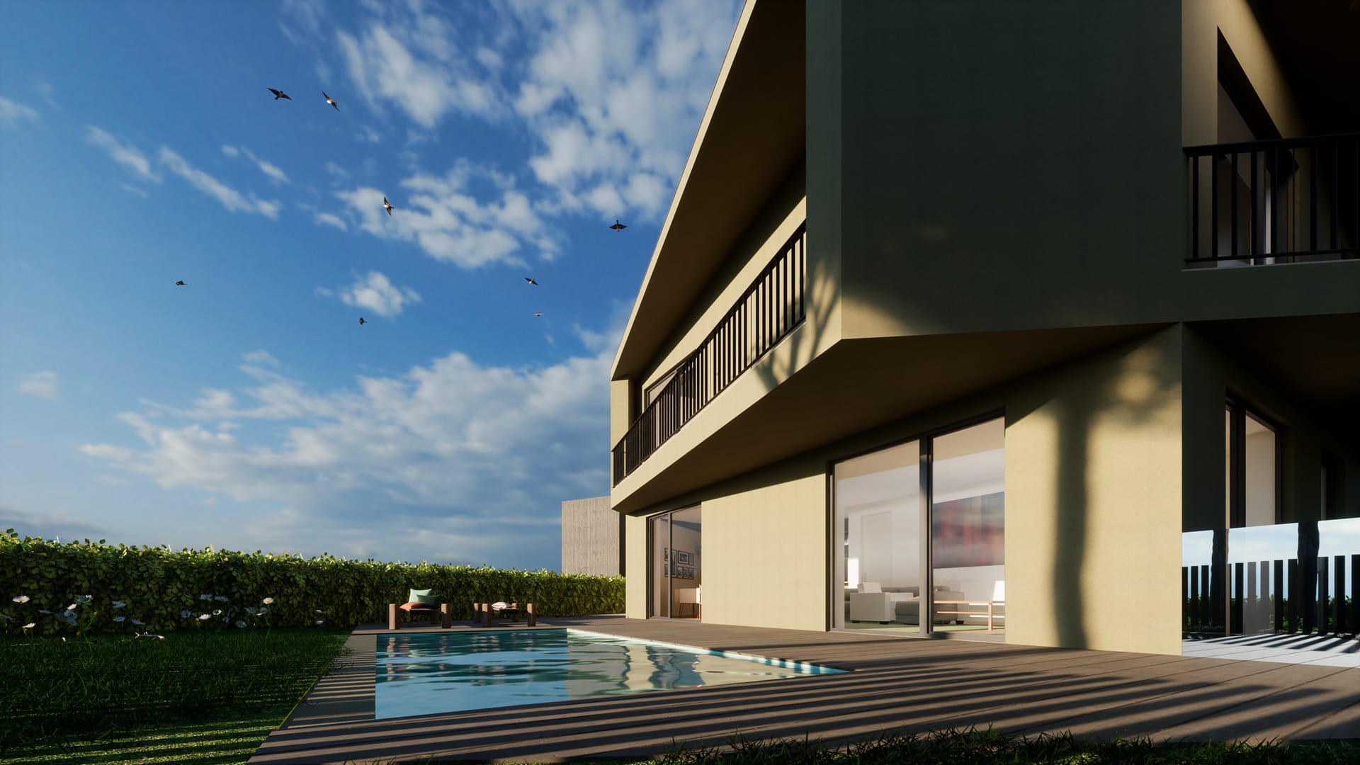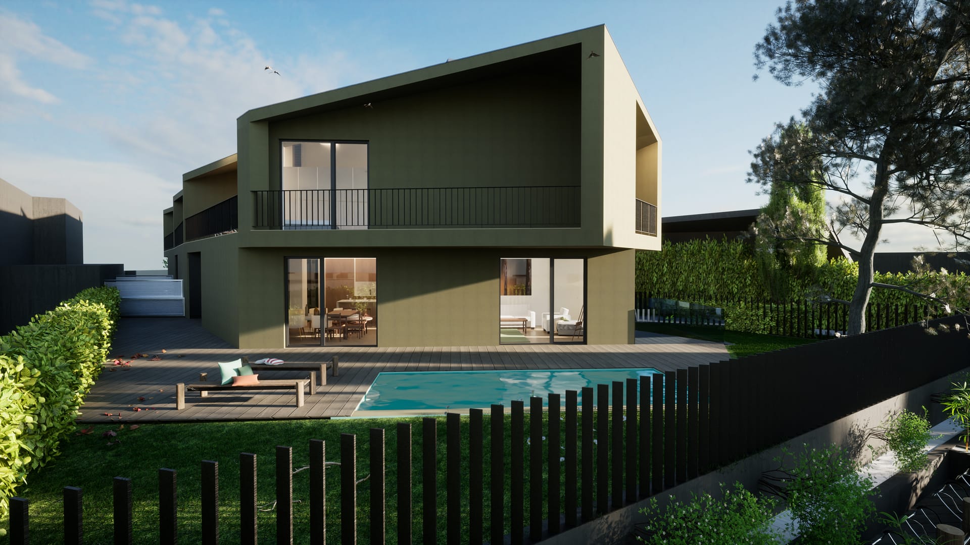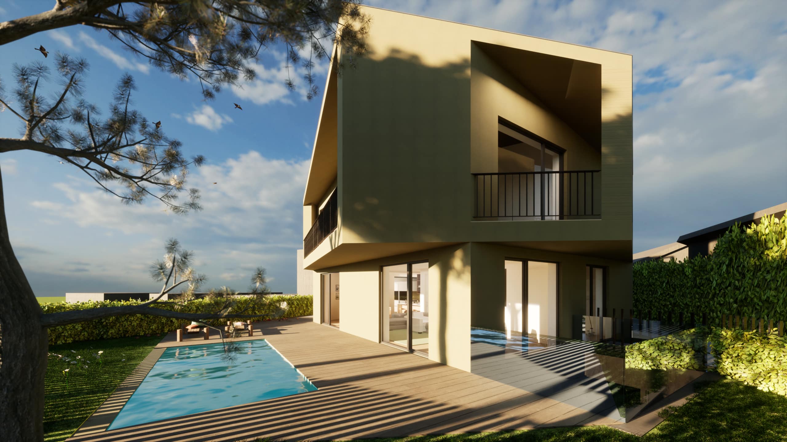 No exterior, a utilização de cubo de granito, deck em madeira e áreas permeáveis ajardinadas reforça a ligação ao espaço natural, promovendo uma vivência equilibrada entre arquitetura e paisagem.