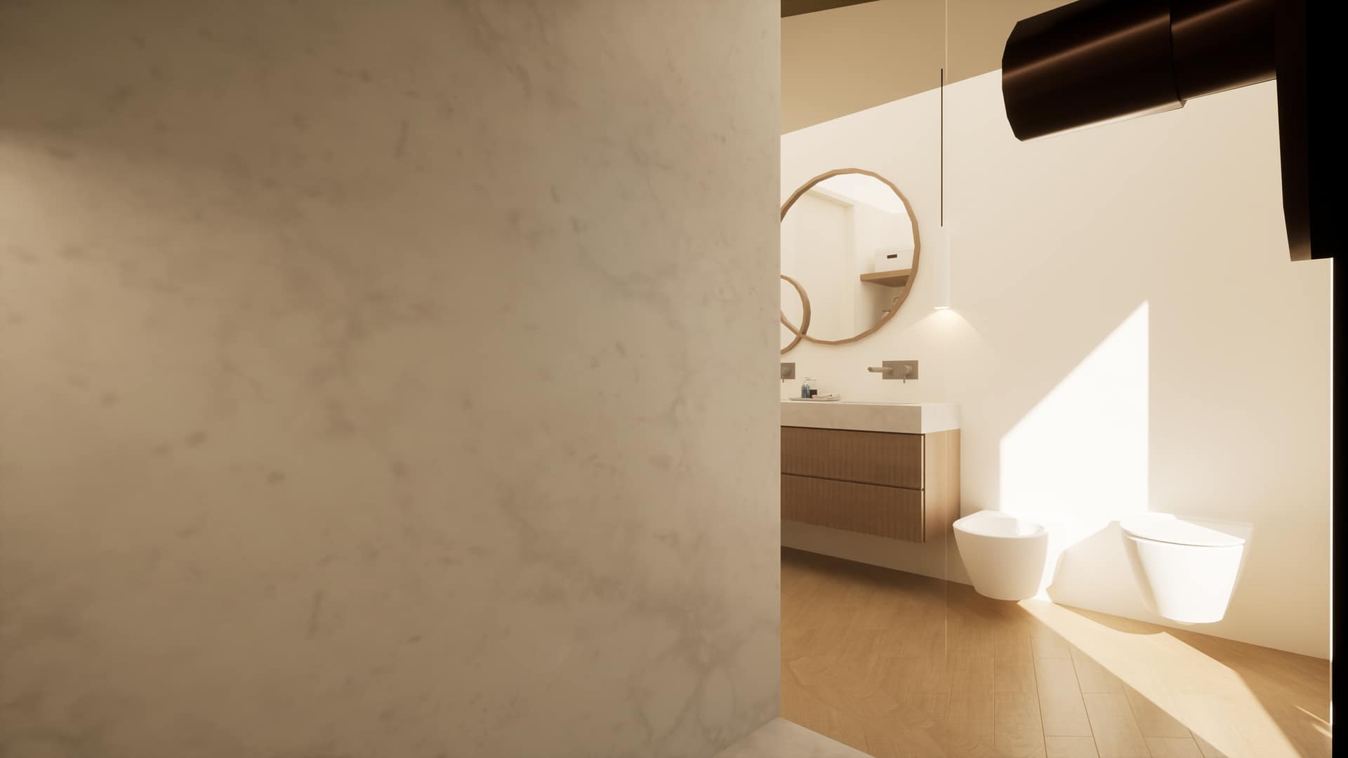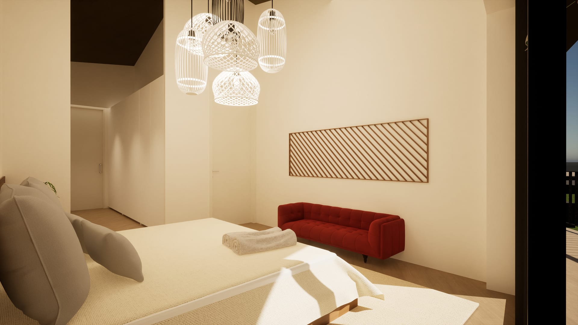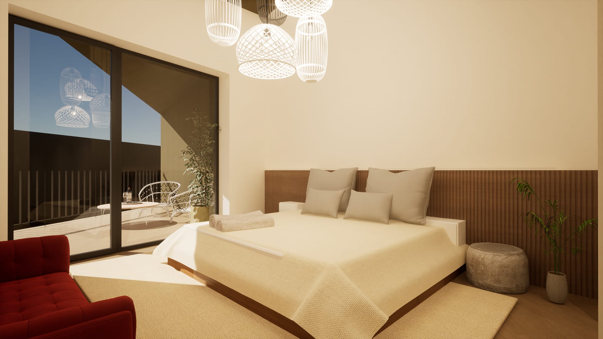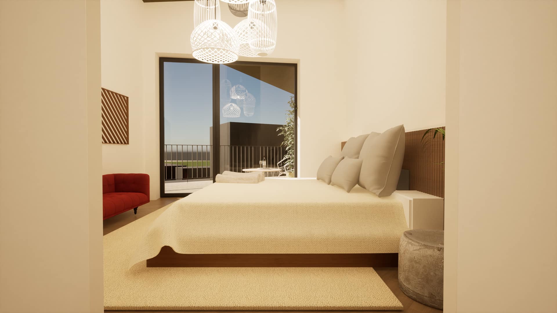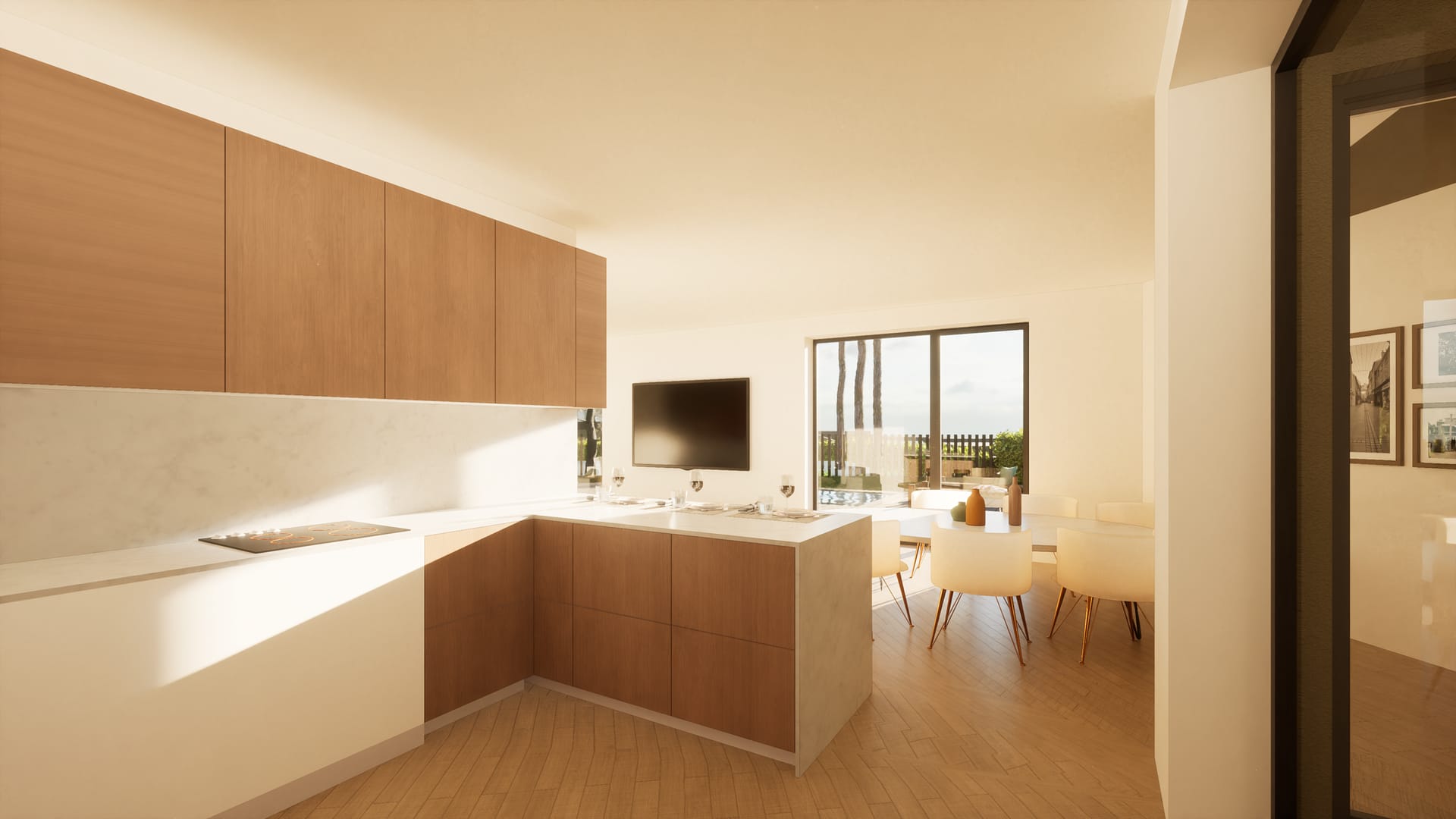 No exterior, a utilização de cubo de granito, deck em madeira e áreas permeáveis ajardinadas reforça a ligação ao espaço natural, promovendo uma vivência equilibrada entre arquitetura e paisagem.