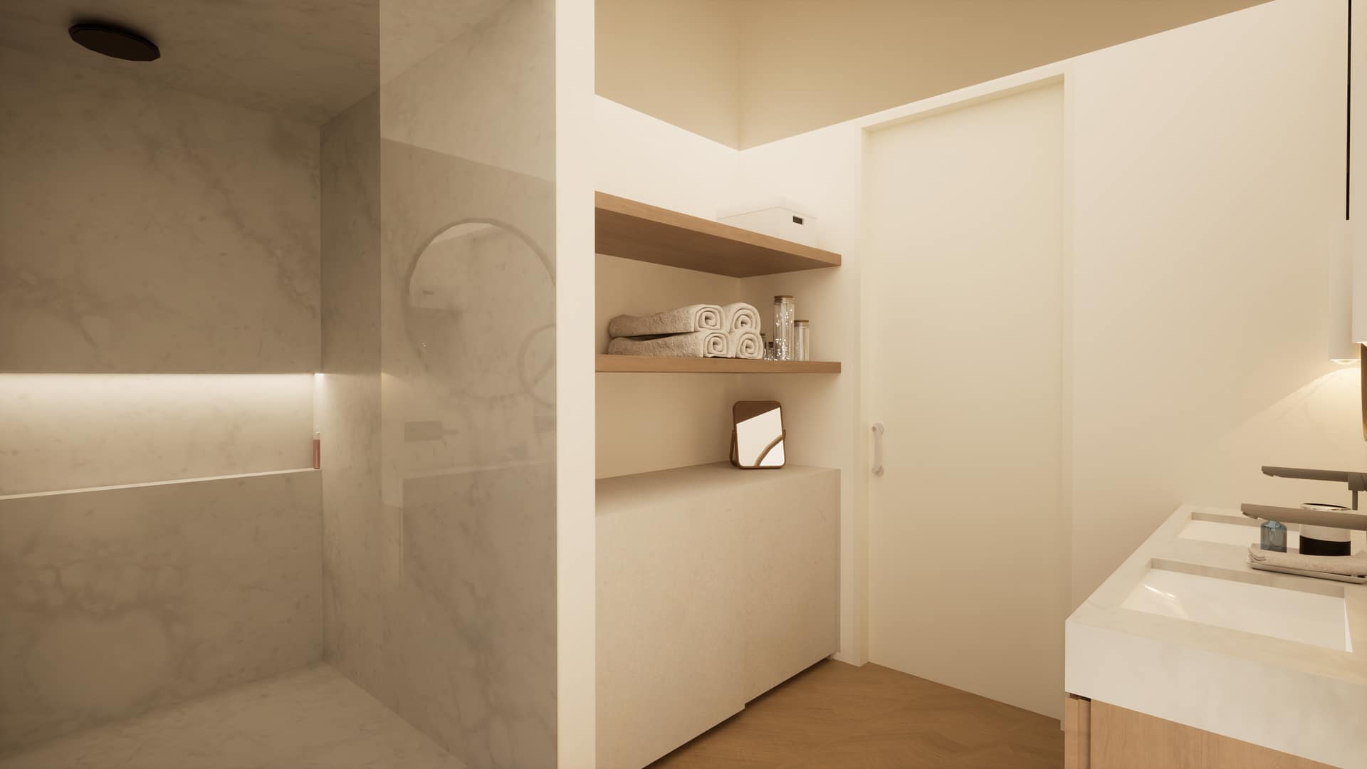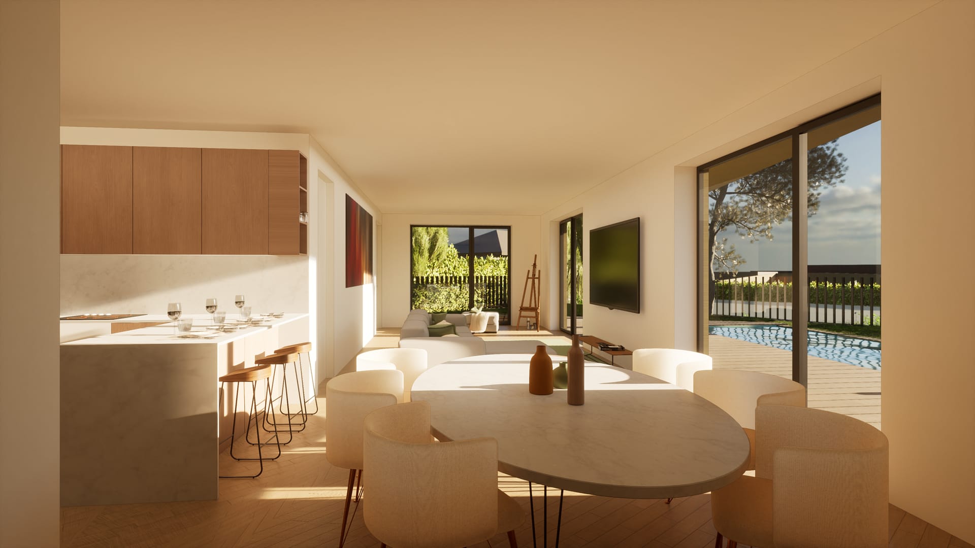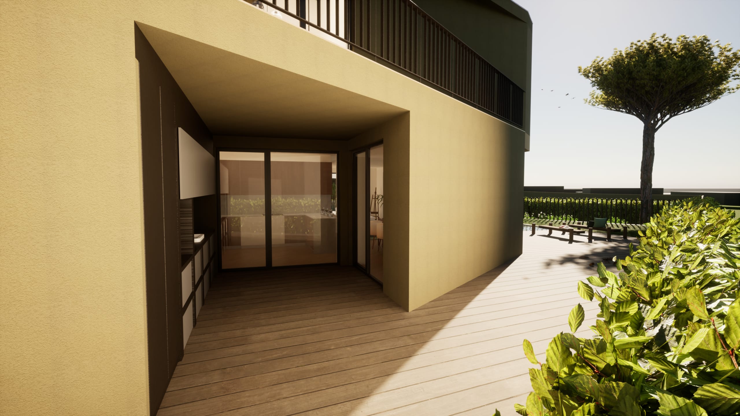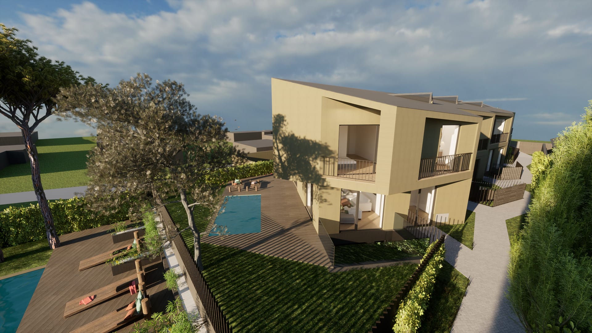 A cave concentra os acessos comuns, as garagens privadas e as áreas de apoio, beneficiando de pátios que garantem iluminação e ventilação natural. No rés-do-chão desenvolvem-se as zonas sociais, com acesso através de um percurso comum que conduz a um espaço ajardinado com piscina. O primeiro andar é reservado às áreas privadas, assegurando maior conforto e resguardo.
