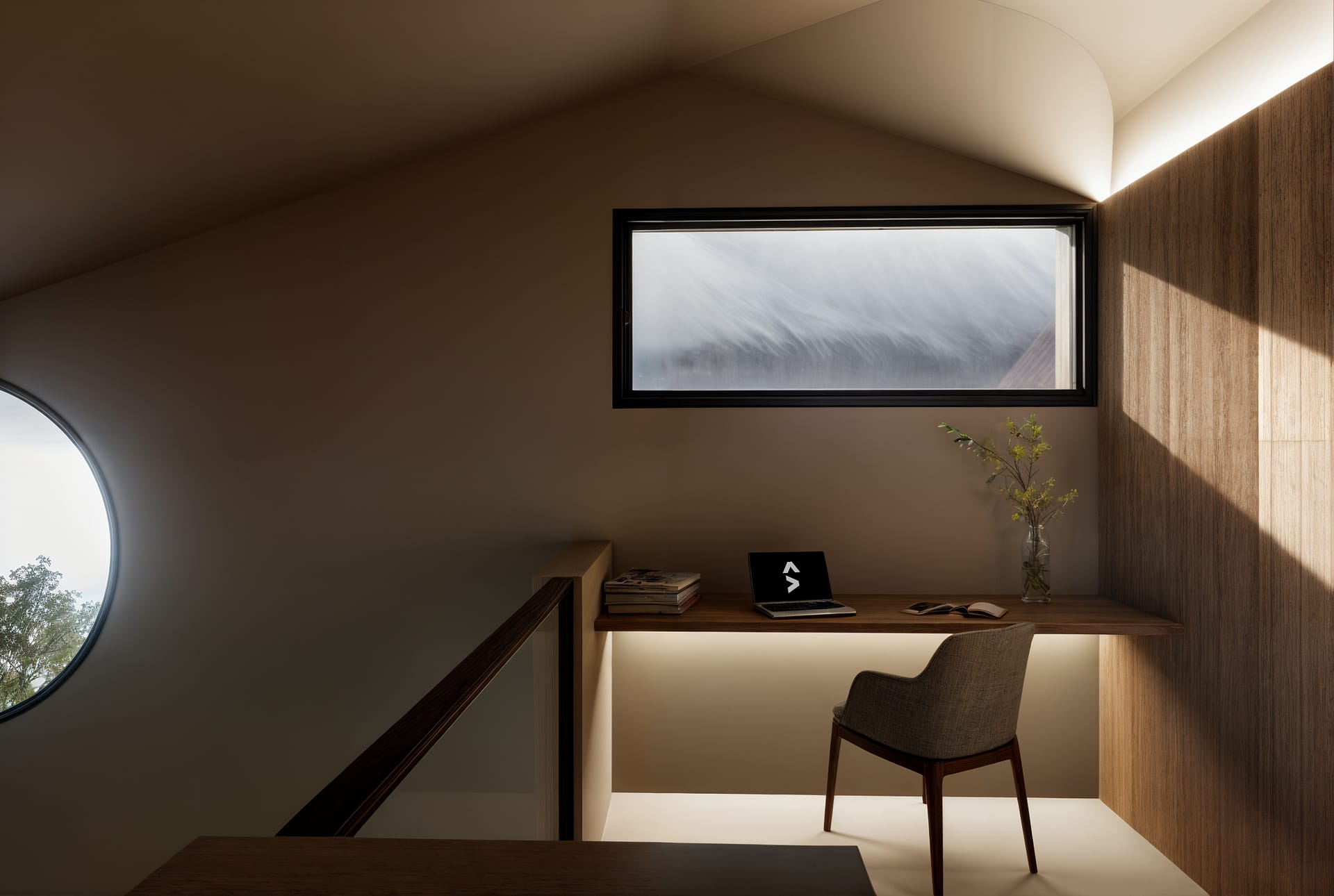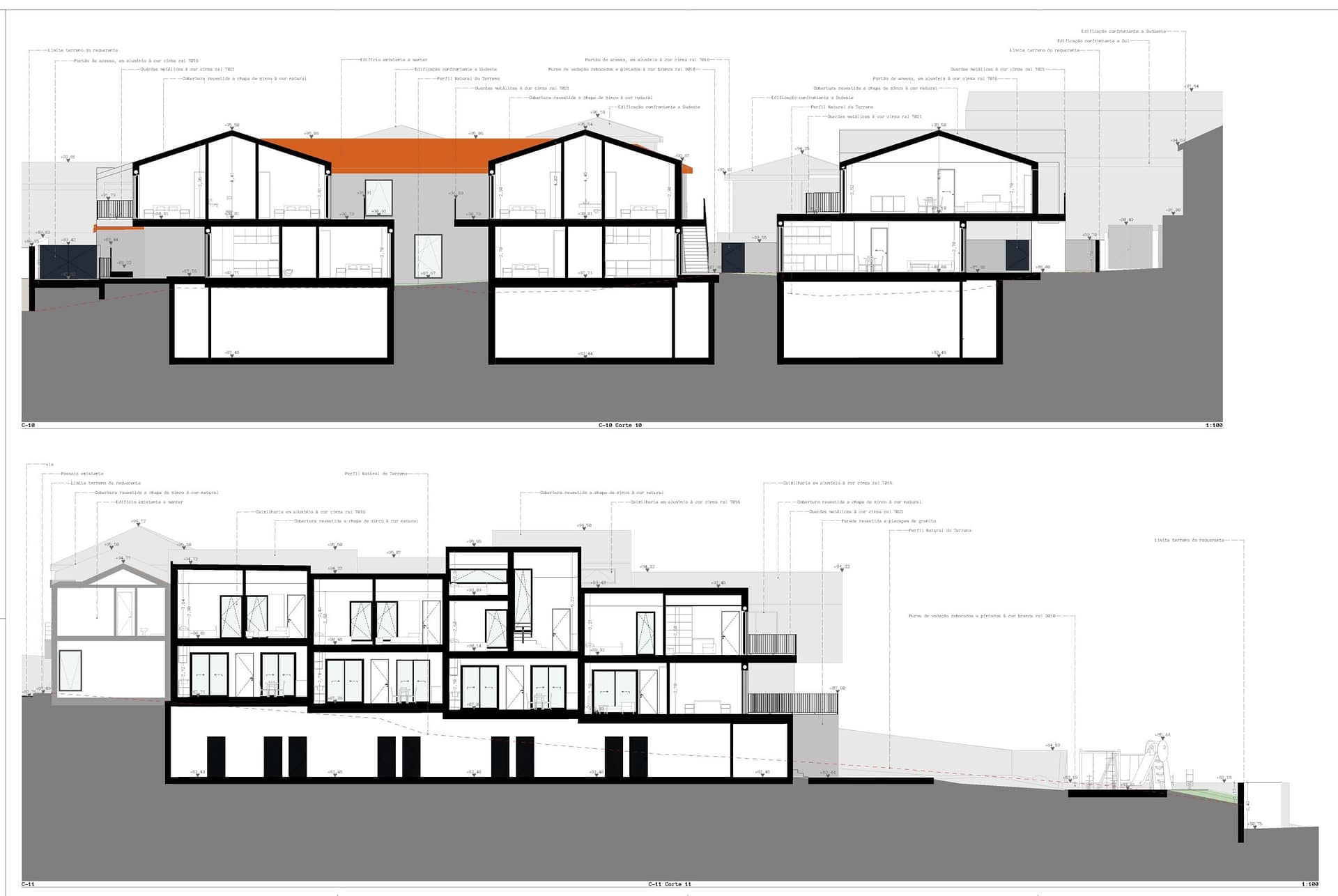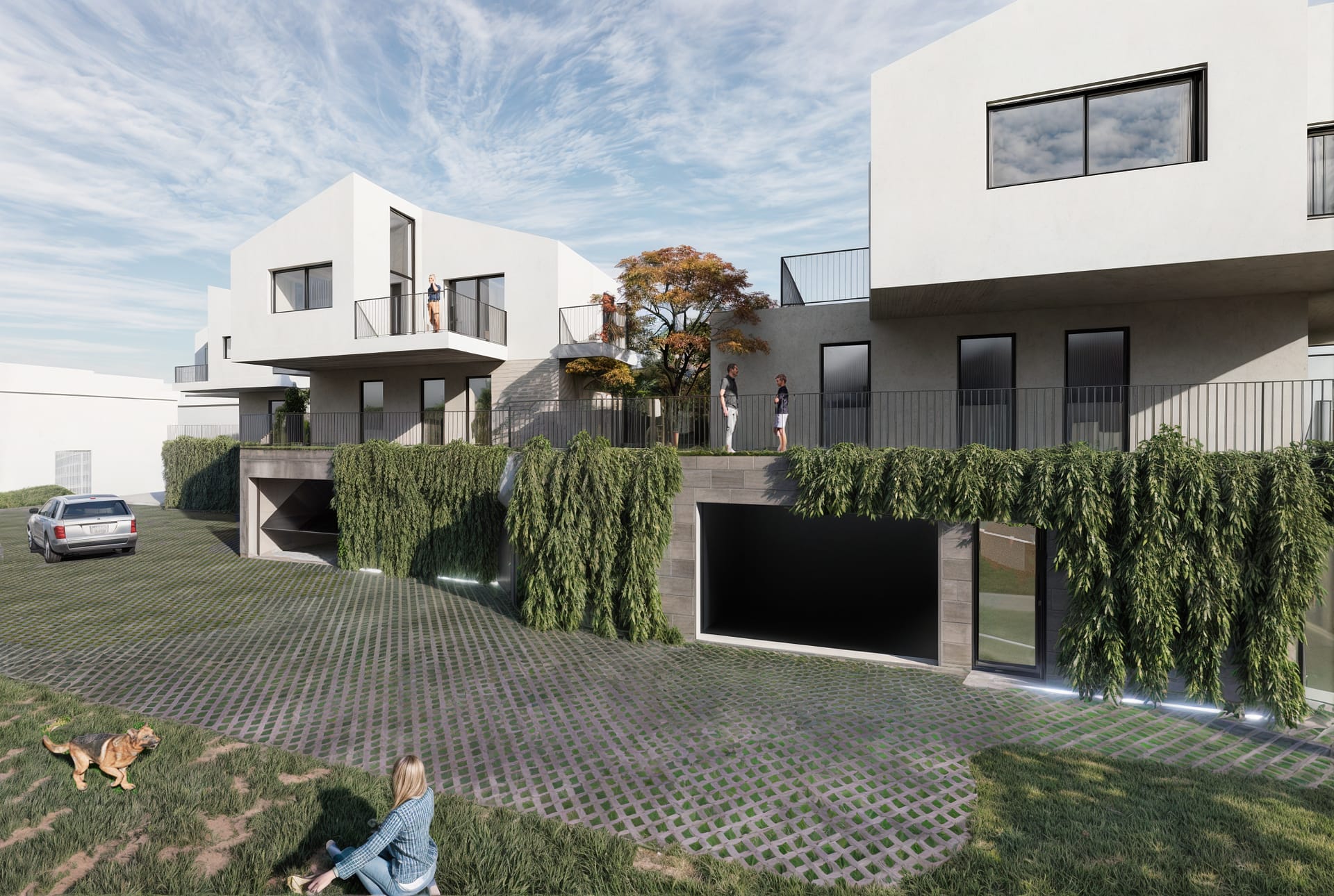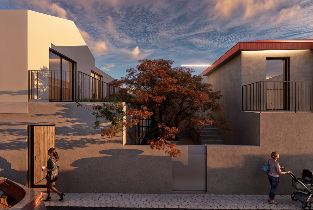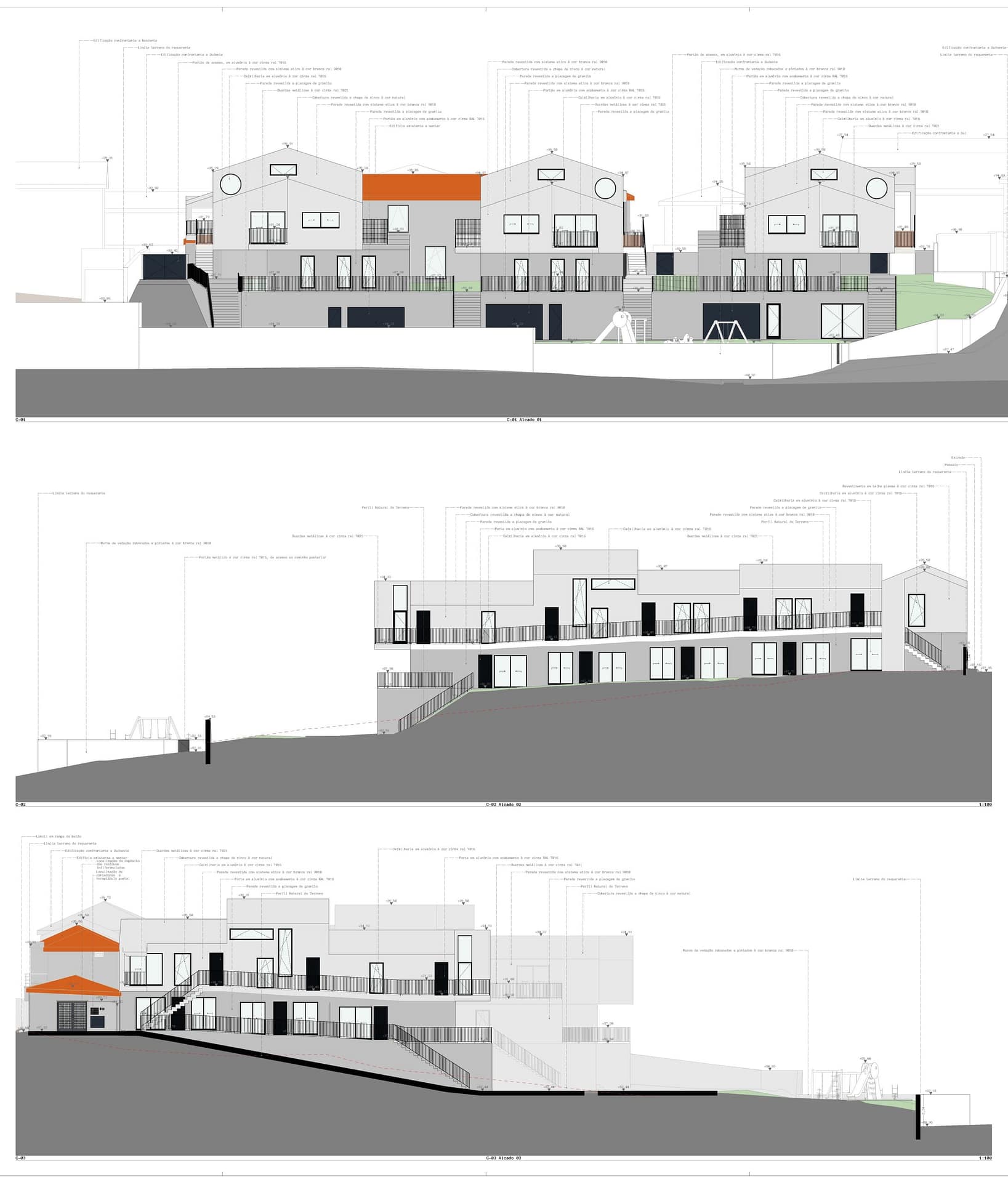 O terreno apresenta uma acentuada inclinação, que foi cuidadosamente considerada na implantação para permitir o escalonamento dos volumes. Essa solução facilita os acessos, reduz o impacto visual e preserva a escala humana do conjunto, promovendo um diálogo harmonioso entre topografia, luz e cotidiano.