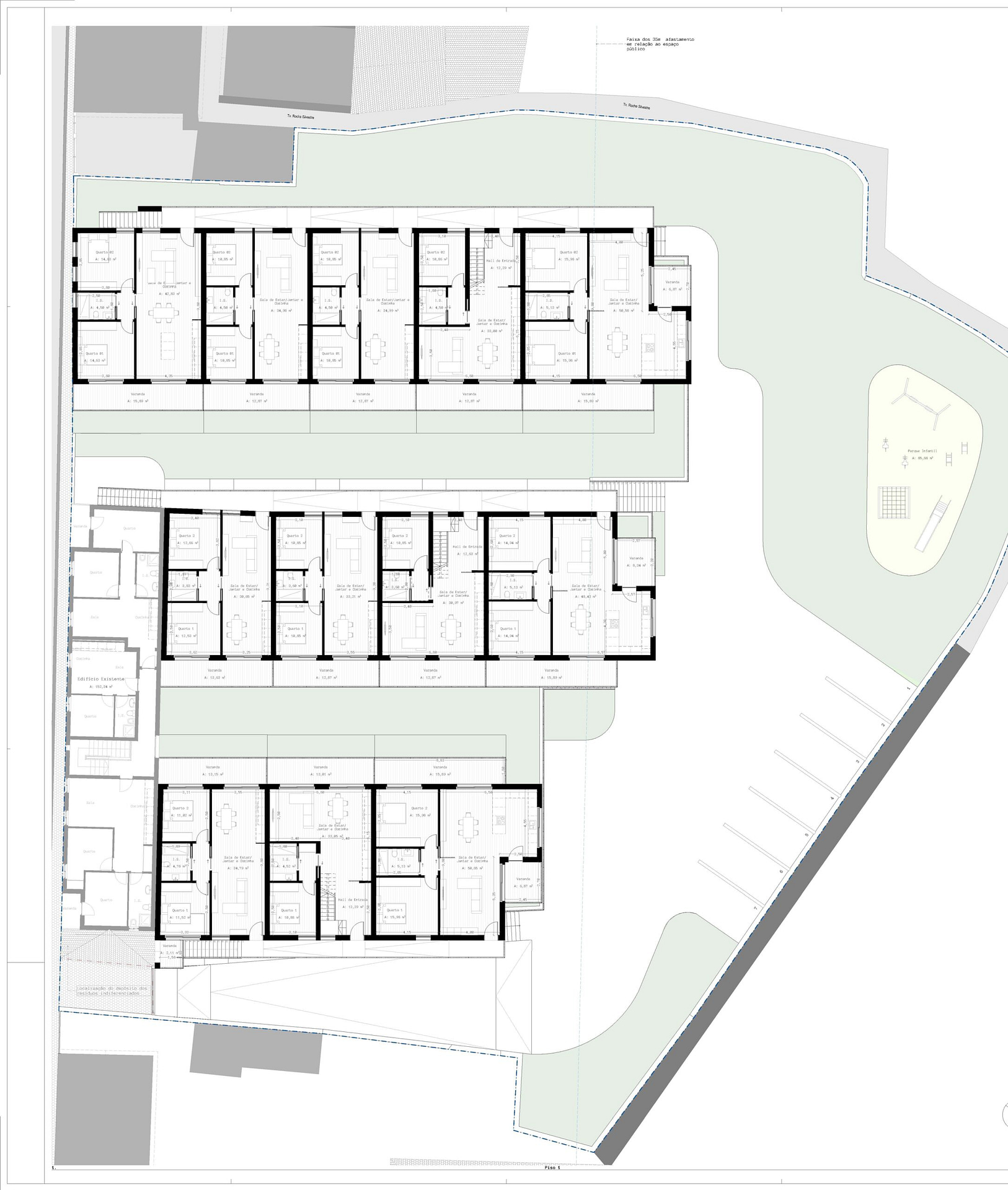 Por fim, a preservação dos muros de alvenaria de pedra no limite norte, reforçados com guarda para segurança, demonstra o cuidado com os elementos existentes e a integração do projeto no tecido urbano consolidado.